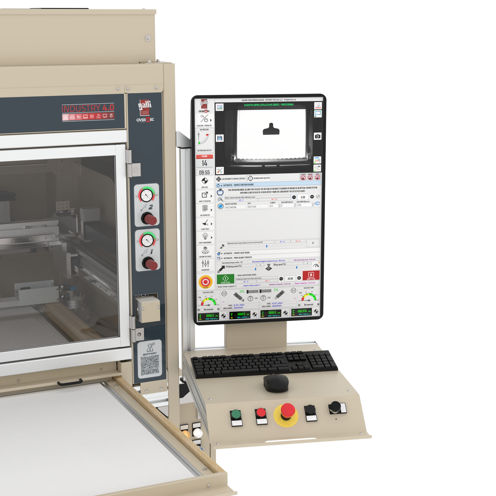 - This machine, using optical machine vision system, is able to automatically detect the pieces positioned on the working table and can glue them in a precise and rapid way. The number of pieces that the machine can recognize is unlimited